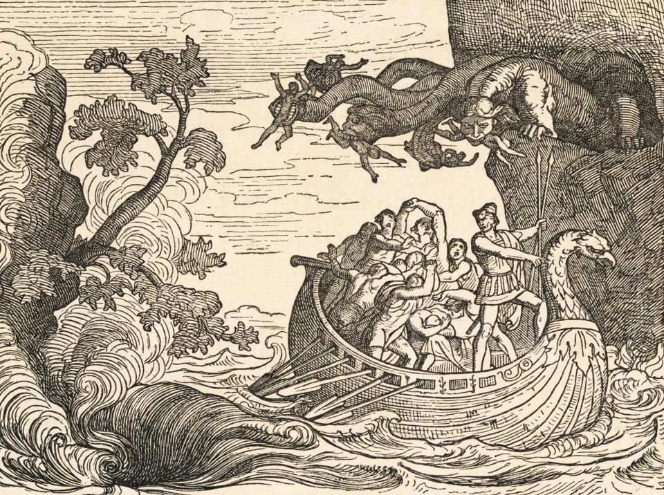 Charybdis and Scylla lived under large rocks, one on each side of a narrow channel. There was no way to escape their trap; the term ‘to be between Charybdis and Scylla’ means being presented with two opposite dangers.
