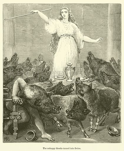 She is mentioned in Homer’s Odyssey when Odysseus visits her island, Aeaea, on the way back from the Trojan war. Circe turns most of Odysseus’ crew into swine. Her ability to change people into animals surfaces again in the fate of Picus. He was an Italian king whom she turned into a woodpecker for resisting her advances.